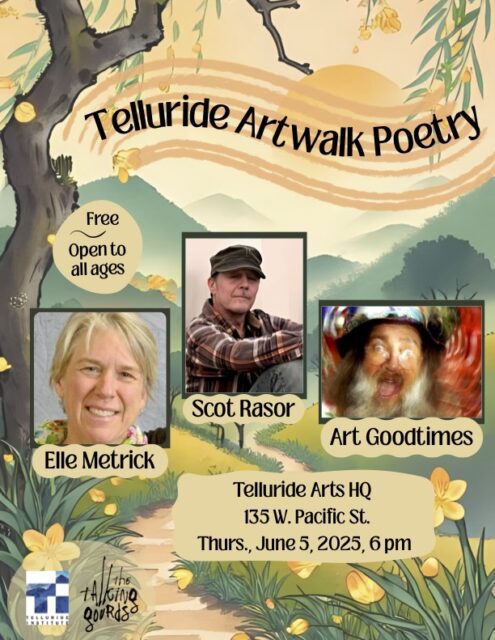 The Telluride Institute’s Talking Gourds Poetry Program has teamed up with Telluride Arts to offer live poetry on Art Walk First Thursdays in Telluride for the summer and fall. The first performance in the series takes place June 5, 6 p.m. at the Telluride Arts Headquarters, 135 W. Pacific St. with Scot Rasor of Placerville, Elle Metrick and Art Goodtimes of Wright’s Mesa.