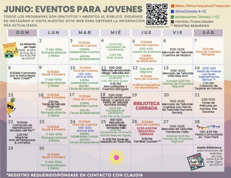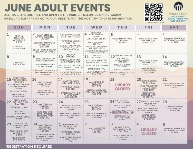Telluride’s Wilkinson Public Library announces its June schedule for adults.