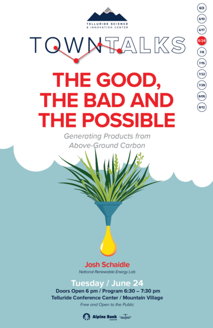This coming week the 2025 Telluride Science Town Talks series continues with “The Good, The Bad, and The Possible: Generating Products from Above-Ground Carbon.” The event features Dr. Josh Schaidle and takes place at the Telluride Conference Center in Mountain Village on Tuesday, June 24, 6:30 pm; doors, 6 p.m.
