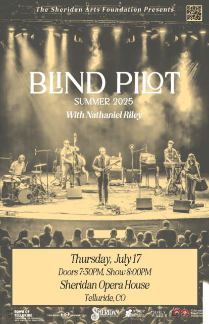Telluride’s Sheridan Arts Foundation (SAF) presents Blind Pilot, live in concert on Thursday, July 17, 2025 at the historic Sheridan Opera House. Music starts at 8:30 p.m.; doors, 7:30 p.m. , Nathaniel Riley will be kicking off the night at 8PM.