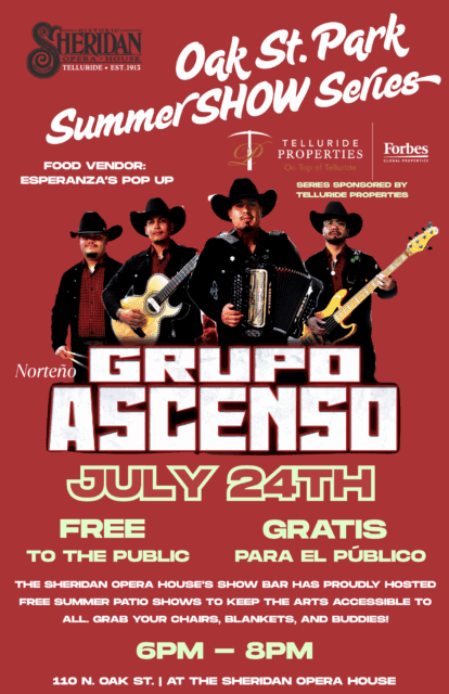 After a hugely successful kickoff to the Sheridan Opera House’s expanded Summer Patio Series, the excitement continues with our second outdoor concert at Oak Street Park on Wednesday, July 24, from 6 to 8 p.m., featuring the high-powered regional Mexican band Grupo Ascenso.