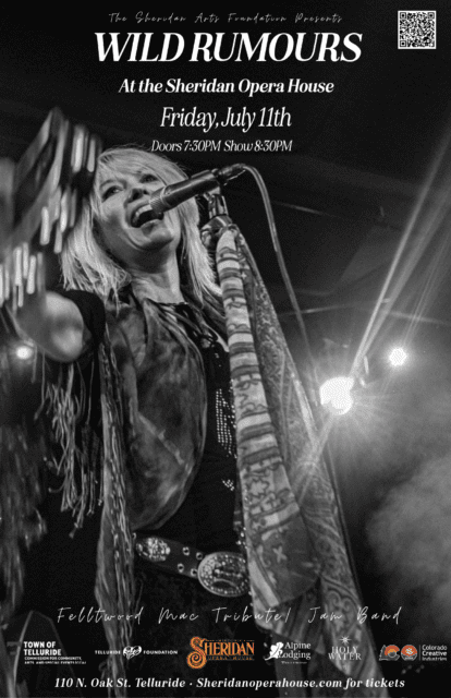 Telluride’s Sheridan Arts Foundation presents Wild Rumours live in concert at the historic Sheridan Opera House. Show takes place Friday, July 11. Doors open at 7:30 pm; music starts at 8:30 pm.