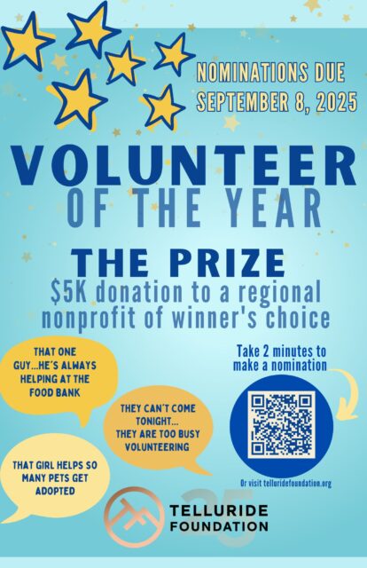 Nomination form is posted and must be submitted on the Telluride Foundation’s website at https://telluridefoundation.org/volunteer-of-the-year/.