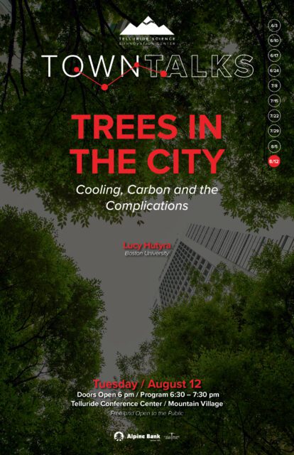 This coming week the 2025 Telluride Science Town Talks series continues with “Trees in the City: Cooling, Carbon, and the Complications.” The event features Dr.Lucy Hutyra and takes place Tuesday, August 12. Doors 6 p.m.; talk, 6:30 p.m