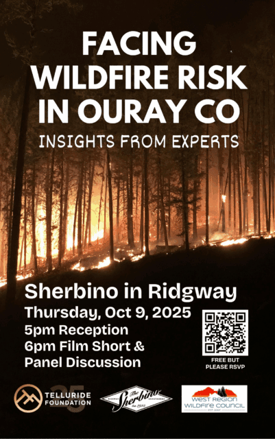As wildfires and other climate related natural disasters become more frequent and severe, how can Ouray County prepare and adapt to this new reality? The panel discussion brings together key voices from local government, wildfire management, and state insurance policy to provide a comprehensive look at how our region, and specifically how Ouray County is addressing this growing threat of wildfires.