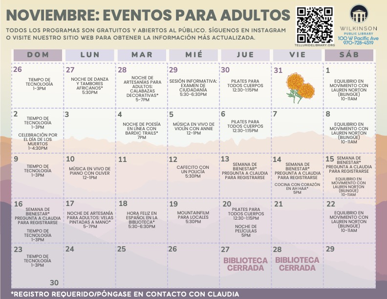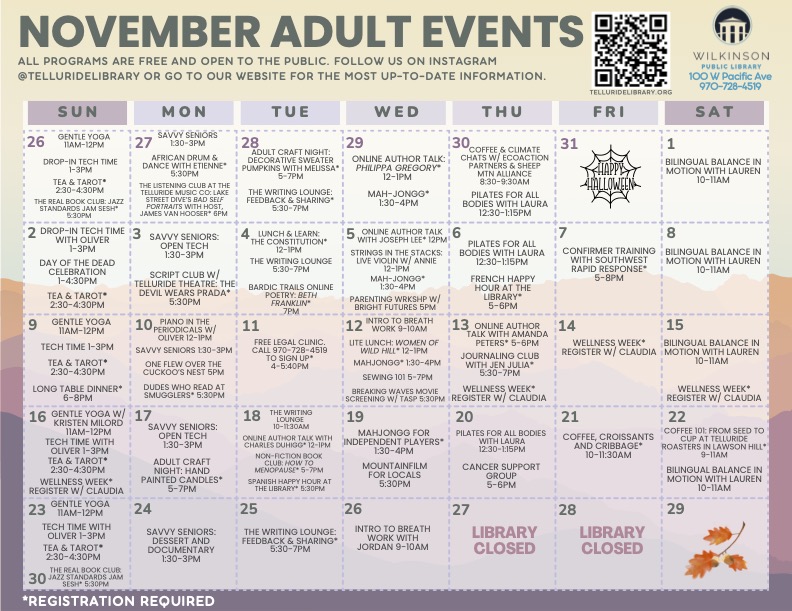Telluride’s Wilkinson Public Library announces its November schedule for adults.