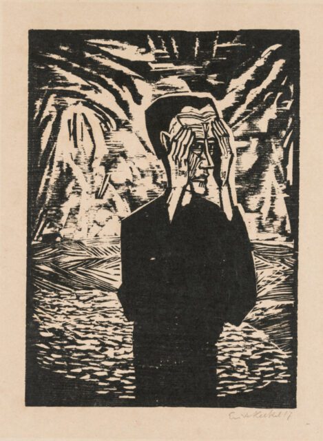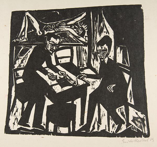 Two Men at a Table, (1913, woodcut), which showcases a psychological drama in a very condensed space.