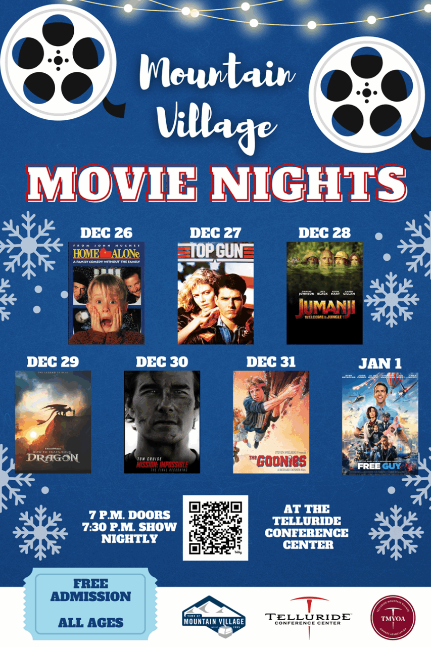 The Town of Mountain Village, Telluride Mountain Village Owners Association and Telluride Conference Center present “Mountain Village Movie Nights” at the Telluride Conference Center, December 26, 2025, through January 1, 2026. The movies are free and open to the public. Doors open at 7 p.m.; showtime is at 7:30 p.m. each night.