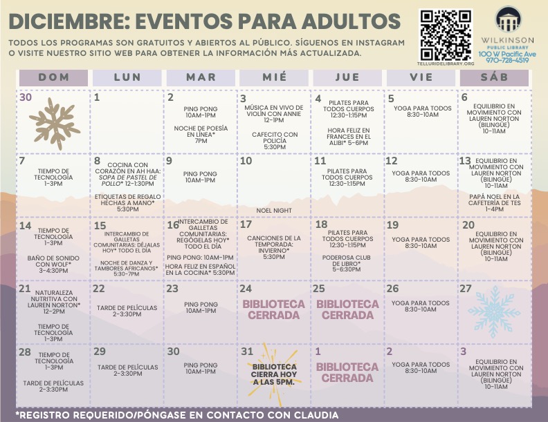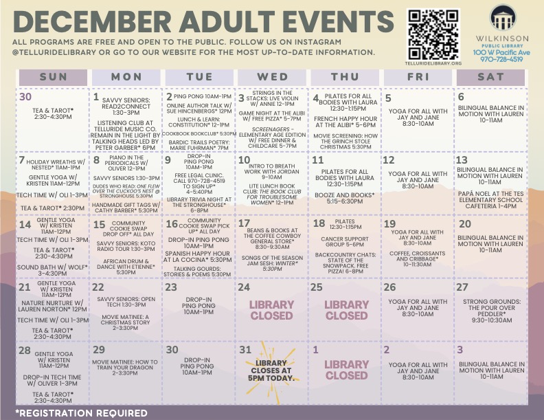 Telluride’s Wilkinson Public Library announces its December schedule for adults.