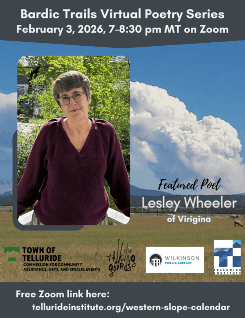 Poet, writer, critic and professor Lesley Wheeler of Virginia will be the featured poet for the Telluride Institute’s First Tuesday Talking Gourds’ Bardic Trails virtual Stories & Poems series on February 3rd, 7 pm MST.