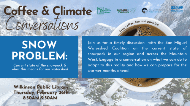 Join EcoAction Partners, Sheep Mountain Alliance, and the Wilkinson Public Library with special guest from the San Miguel Watershed Coalition for a timely discussion on our current state of the snowpack in our region and what this means for our local watershed.