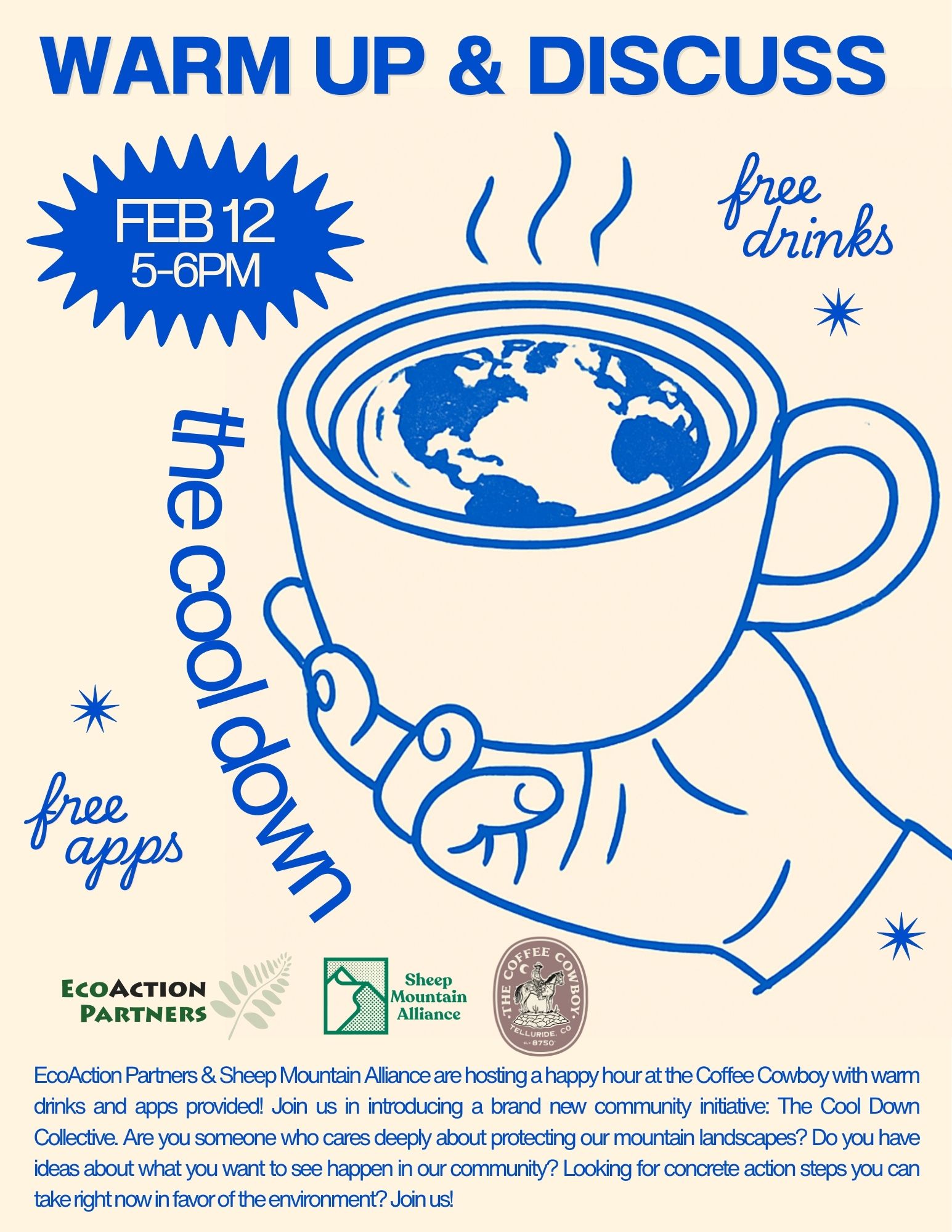 EcoAction Partners & Sheep Mountain Alliance are hosting a happy hour at the Coffee Cowboy with warm drinks and apps provided Thursday, February 12th from 5-6 PM. Join us in introducing a brand new community initiative: The Cool Down Collective.