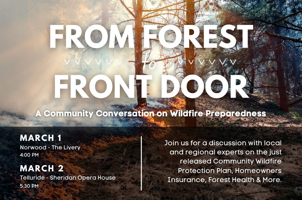 The San Miguel Office of Emergency Management and the Telluride Foundation are hosting a free panel discussion, “From Forest to Front Door,” a conversation that will kick off the public comment period for the county’s newly completed draft plan, as well as highlight other issues related to wildfire risk, including building codes, insurance, and mitigation and resiliency efforts.