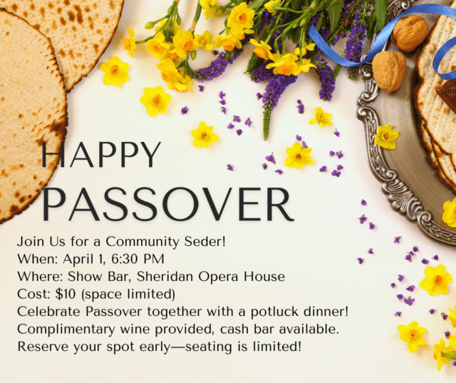 April 1 — Community Seder at the Show Bar. Tickets here ($10). Food sign up here.