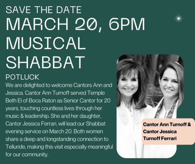 March 20 —Next week, we hope you will come celebrate with your Telluride community, Cantor Ann Turnoff and her daughter, Cantor Jessica Ferrari. RSVP here.