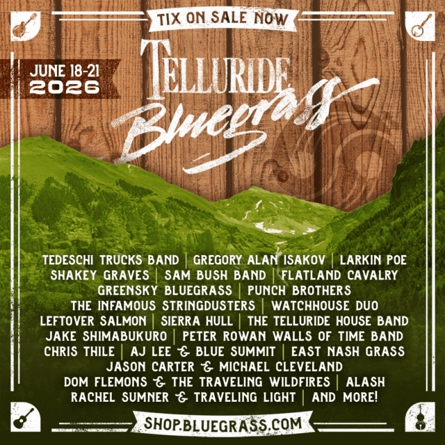 Recently, Telluride Bluegrass promoters Planet Bluegrass shared the lineup for 2026’s Telluride Bluegrass Festival, with returning festivarian-favorites, exciting Telluride debuts, and all-time greats taking the stage over the long weekend of June 18-21, 2026.