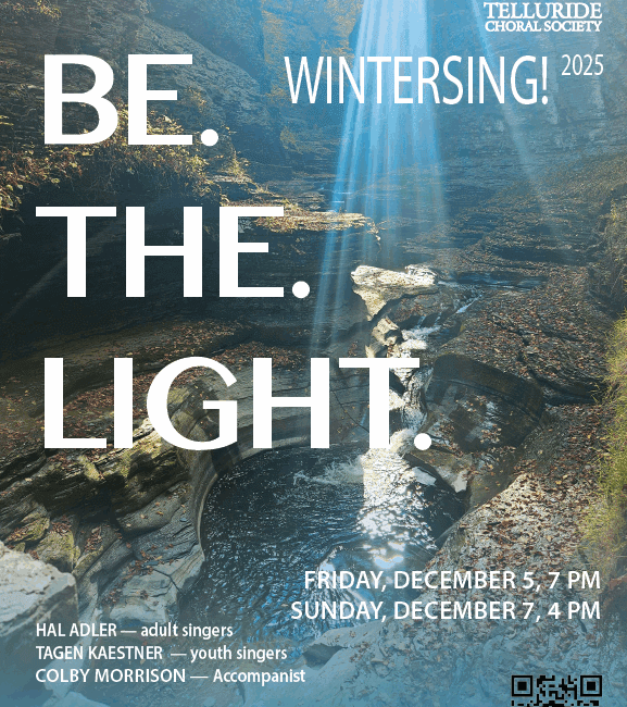 Performances of the Telluride Choral Society’s WinterSing 2025 take place Friday, December 15, 7:00 p.m and Sunday, December 7, 4:00 p.m. at Christ Church. Tickets are $20 for ad