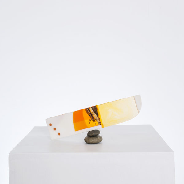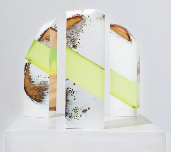 That description equally applies to Parrish’s art, flashes of color – how we see a world in motion – captured in planed wooden planks wrapped in layers of semi-transparent and color-infused bio-resin. These works, fusions of painting and sculpture, are very physical abstractions that capture and freeze many of the breakneck moments in the artist’s life when his perceptions of the world are intensified, when colors develop richer personalities.