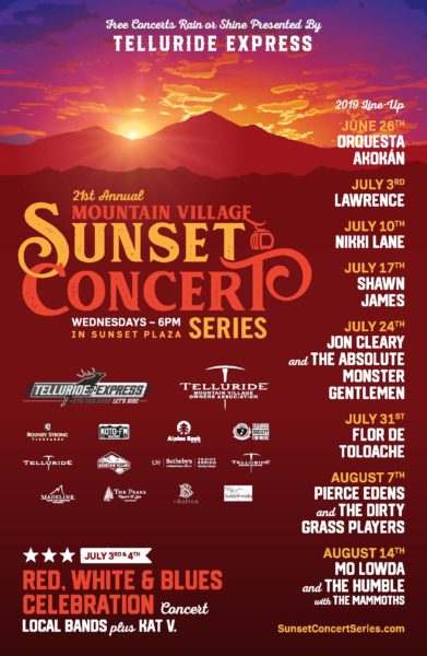 Posted at 16:18h, 01 July[…] The Telluride Mountain Village Owners Association is pleased to announce the lineup and events for the 2019 Red, White and Blues Celebration which takes place July 3 and 4, 2019, at Sunset Plaza, on the lawn near Lift 1 and at Heritage Plaza near the base of Lift 4. Learn more about the Red, White & Blues Celebration and event by contacting the Telluride Mountain Village Owners Association at (970) 728-1904 or by visiting tmvoa.org and the Sunset Concerts on Telluride Inside…and Out. […]