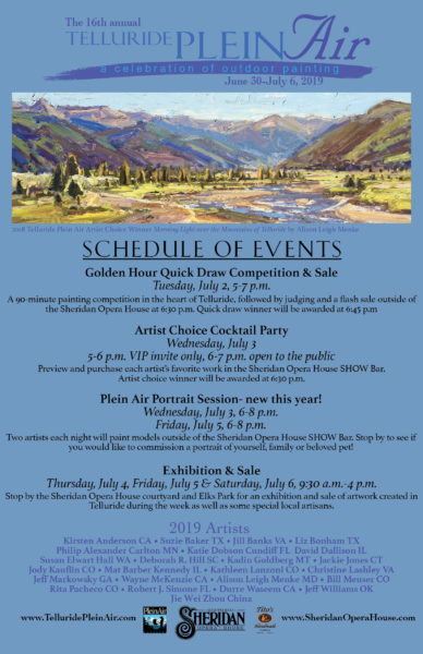 For a complete schedule of events, artist information, painting locations and sponsorship opportunities, please visit the Telluride Plein Air website at www.telluridepleinair.com or visit the Sheridan Arts Foundation website at sheridanoperahouse.com.