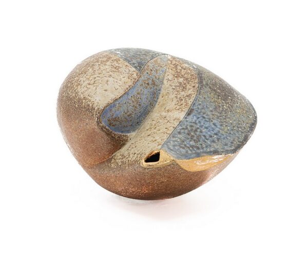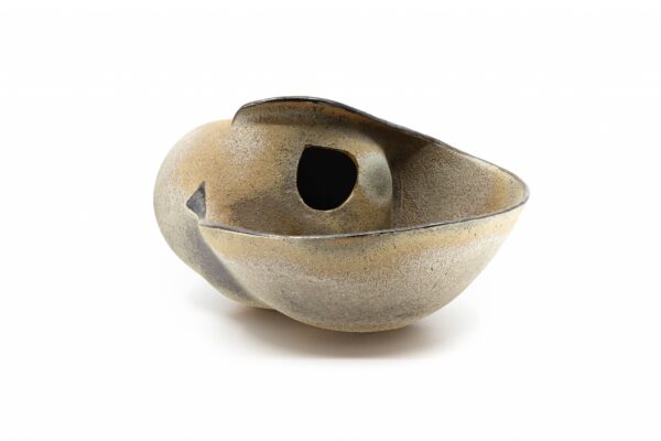 Fire leaves its mark on each piece, dapples of carbon, smooth glassy surfaces and toned down colors that are more muted and earthy. The hand-built work, however, still retains the surreal shapes that are Vanhille’s signature.