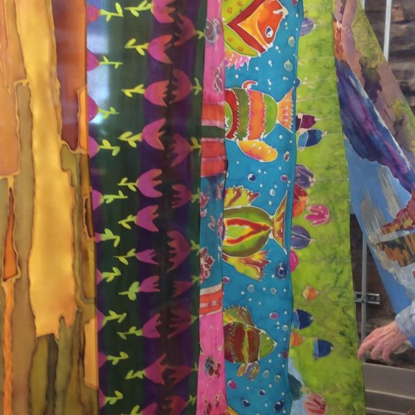 Baked in Telluride features the latest of eight local artists’ spectacular silk batiks from Kathy Green’s Ah Haa studio class. Their colorful designs reflect this year’s theme of “Water, Flowers, and Landscapes.”