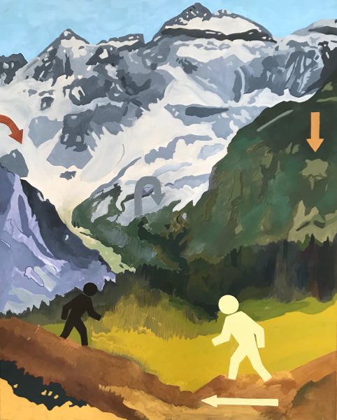 “In this group of on-site paintings, I strove to create a sense of the mountain world and become intimate with the geography and its distinguishing forms. Two series, ‘Walking Man’ and ‘” introduce forms that represent man’s presence in the landscape. The appearance of these shapes stand in contrast to the natural environment and emphasize the flat surface of the picture plane. These are not the picture- window view of the landscape.