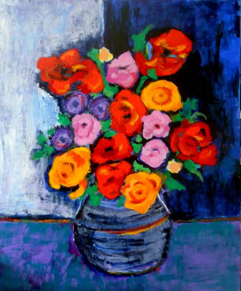 “Painting is how I can best tell the truth. It is a messy unpredictable process for me. Colors also make me happy and I just LOVE fresh flowers in a room. They just make me feel hopeful and alive. I especially love to see them this time of year as the winter settles into my bones, they bring memories and anticipation of Spring and Summer and new beginnings. I study and practice yoga. Painting is a spiritual practice as well. Showing up to the canvas is the most important part. I try to show up with a beginner mind and see what will happen. I live and work in Ridgway, Colorado. I grew up back East in New York. I love art, mountains, my family, yoga, and figuring out how to be a human being. I work as an artist, yoga teacher, and free-lance graphic designer.”