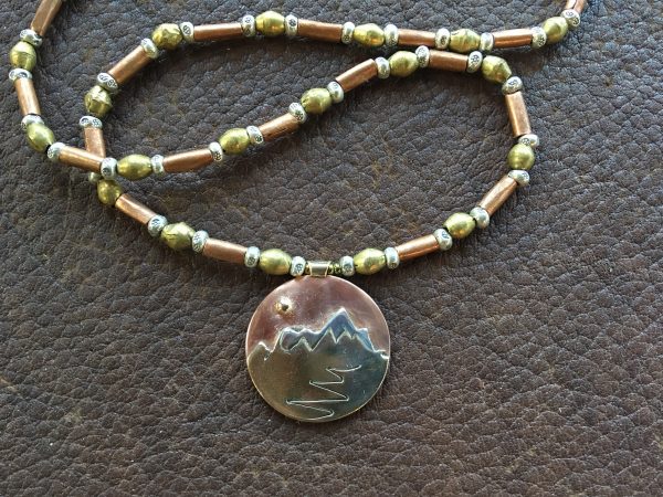 Sue Hill is a metalsmith, who enjoys beading. She loves creating with her hands and working with a tapestry of colors, shapes and energies of natural objects. She likes to make representations of her surroundings and often use mountain motifs.