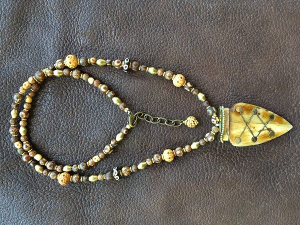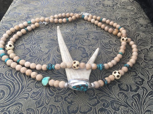 Hill finds her inspiration in nature as well as the materials and stones she uses. Materials range from found objects/rocks to antlers and cut stones.
