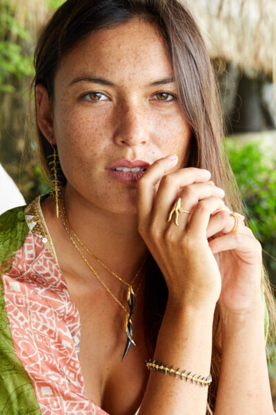 “I also definitely have love affair with every new member of our animal kingdom. Current favorites are the ‘Bear-Madu’ (means Honey in Indonesian), Wolf-Shera and hand-carved mini-bone snake earrings, described as pequeno or small in Spanish.”