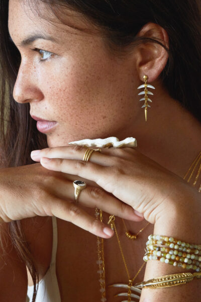 “It is out of my deep love, appreciation and reverence for our natural world that I choose yo use only ethically sourced materials like cruelty-free bone from naturally shed deer antler, topographic-patterned, sliced-banded agates borne from volcanic rock, jasper, shell, chalcedony, fossil and agate, recycled silver and gold. In fact, the heart of my creations is engagement with the natural world, connecting us to beauty at its purest, organic level. My wish is the relationship to nature in my jewelry lines, via sustainable minerals and metal, will promote the awareness and compassion so deeply needed to save our planet and all its beings.”